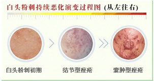 粉刺不及时治疗可进一步发展会演变成各种炎症性皮损,表现为炎性丘疹、脓疱、结节和囊肿。